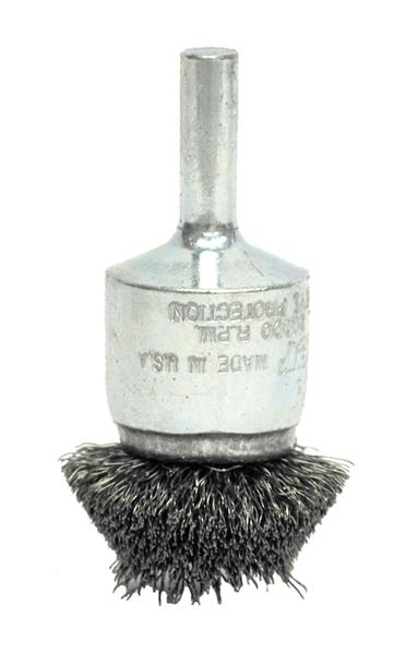 Weiler 1-1/4" Circular Flared Crimped Wire End Brush features wire fill which has been "pre-flared" to match the working angle of the brush at operating speed and suited for addressing broad and slightly contoured surfaces on steel parts. 1/4" stem diameter for use on die grinder, drill, drill press and right angle air die grinder.