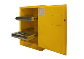 FM approved, flammable storage cabinet, holds 24 Aerosol cans, 1 door, manual close, 2 sliding shelves, safety yellow