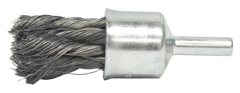 Weiler 1/2" Knot Wire End Brush features a hollow end, heavy-duty brushing action with some flexibility for more demanding cleaning and deburring applications in recessed areas on steel parts. 1/4" stem diameter for use on die grinder, drill, drill press, right angle die grinder and straight grinder.