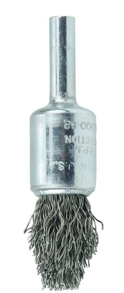 Weiler 1/2" Controlled Flare Crimped Wire End Brush is a uniquely trimmed crimped wire fill for more effective brushing action and greatly enhanced durability when cleaning corners and filet welds. 1/4" stem diameter for use on die grinder and right angle die grinders.