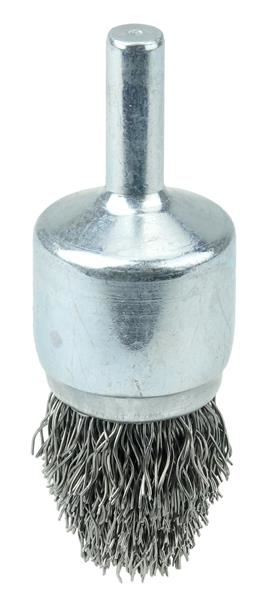 Weiler 3/4" Controlled Flare Crimped Wire End Brush is a uniquely trimmed crimped wire fill for more effective brushing action and greatly enhanced durability when cleaning corners and filet welds. 1/4" stem diameter for use on die grinder and right angle die grinders.