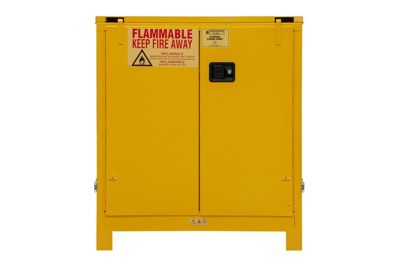 FM approved, flammable storage cabinet with legs, 30 gallon, 2 doors, self close, 1 shelf, safety yellow