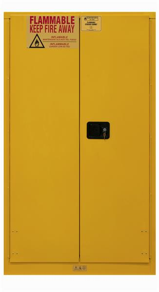 FM approved, flammable storage cabinet, 60 gallon, 2 doors, manual close, 2 shelves, safety yellow.