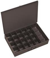 21 Compartment large scoop box. Prime cold rolled steel. Interlocking and welded construction. Positive pull-down catch keeps cover tightly closed to prevent part migration. Handle allows for easy transport. Gray powder coat finish. Measures 18 in. width by 3 in. height by 12 in. depth.