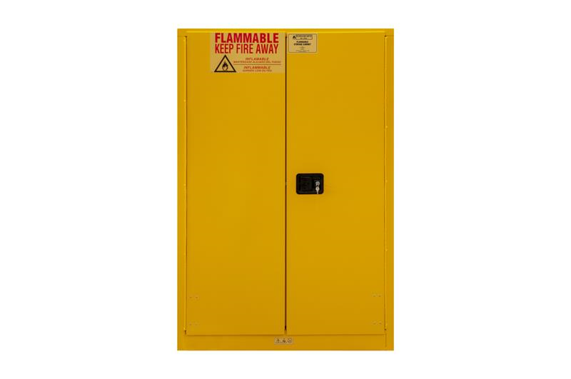 FM approved, flammable storage cabinet, 90 gallon, 2 doors, manual close, 2 shelves, safety yellow.