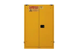 FM approved, flammable storage cabinet, 90 gallon, 2 doors, self close, 2 shelves, safety yellow.