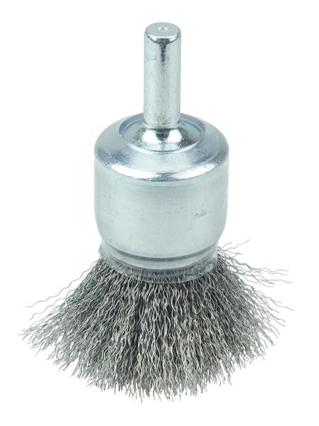 Weiler 3/4" Coated Cup Crimped Wire End Brush features a solid end construction and very flexible brushing action. ideal for more demanding light-duty cleaning applications in corners and hard-to-reach areas. 1/4" stem diameter for use on die grinder and right angle die grinders.