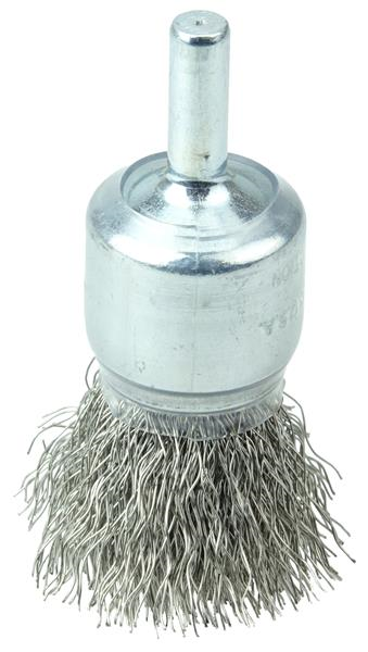 Weiler 3/4" Coated Cup Crimped Wire End Brush features a solid end construction and very flexible brushing action. ideal for more demanding light-duty cleaning applications in corners and hard-to-reach areas. 1/4" stem diameter for use on die grinder and right angle die grinders.