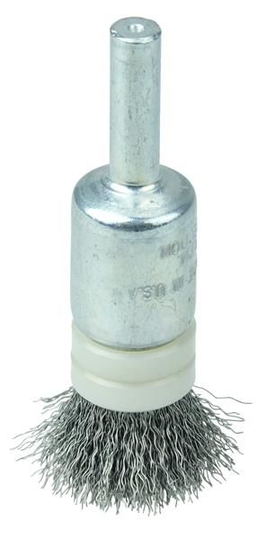 Weiler 1/2" Banded Crimped Wire End Brush features a pair of bands around the fill to reduce the exposed trim length and light weight brush flaring at operating speed. Provides an aggressive, controlled brushing action. 1/4" stem diameter for use on die grinder and right angle die grinders.