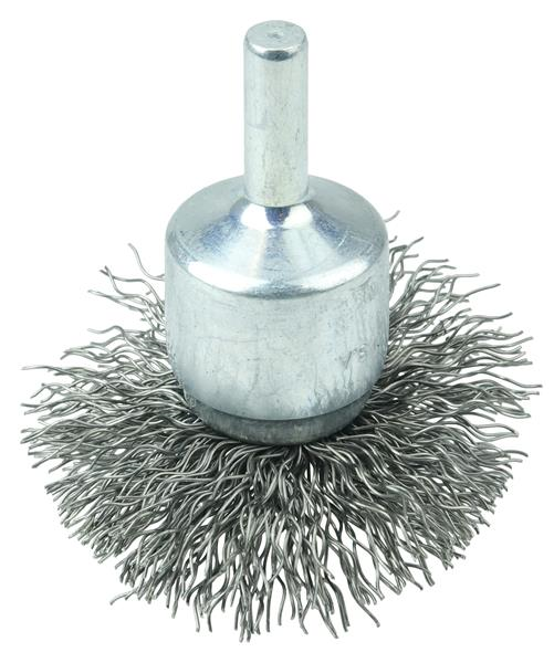Weiler 2" Circular Flared Crimped Wire End Brush features crimped wire fill which has been "pre-flared" to match the working angle of the brush at operating speed and suited for addressing broad and slightly contoured surfaces. 1/4" stem diameter for use on die grinder and right angle die grinders.