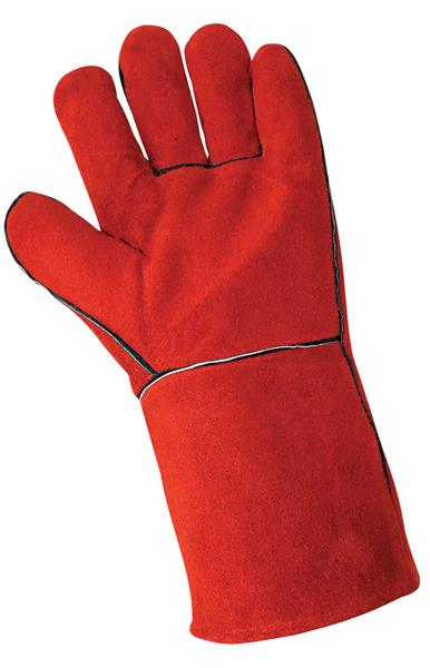 Economy shoulder split cowhide leather welders glove, red color, featuring a wing thumb, hemmed cuff, welting in all vulnerable seams for added wear and protection, and a full semi-sock thermal-knit cotton lining for comfort and added heat protection.