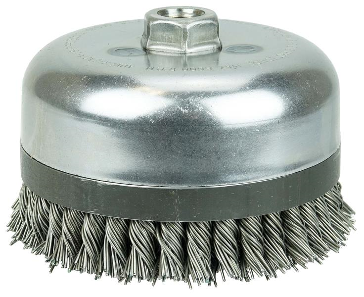 Weiler 6" Banded Double Row Knot Wire Cup Brush provides very aggressive brushing action while still maintaining some flexibility. Ideal for Severe Cleaning Applications. 5/8"-11 nut for use on right angle grinders.