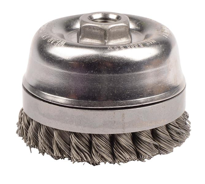 Weiler 4" Banded Double Row Knot Wire Cup Brush provides very aggressive brushing action while still maintaining some flexibility. Ideal for Severe Cleaning Applications. 5/8"-11 nut for use on right angle grinders.
