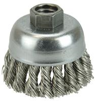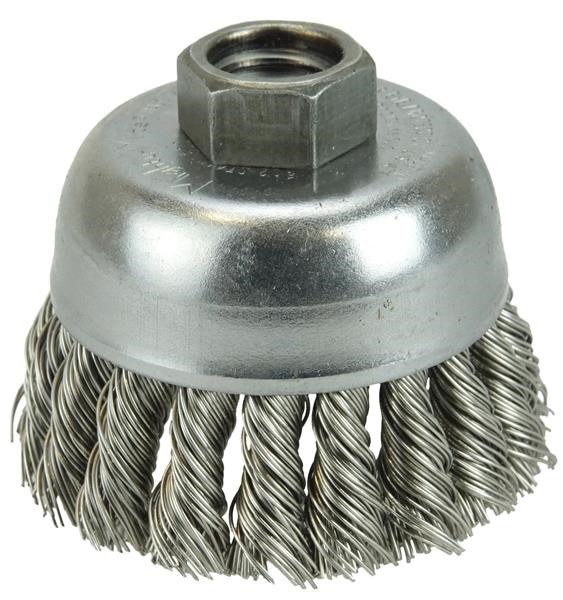 Weiler 2-3/4" Single Row Knot Wire Cup Brush provides heavy-duty brushing action with some flexibility. Ideal for demanding cleaning applications on relatively flat surfaces. 5/8"-11 nut for use on right angle grinders.
