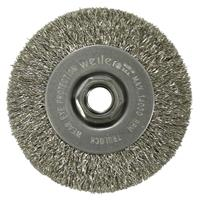 Weiler 4" Narrow Face Crimped Wire Wheel Brush provides a flexible brushing action and consistent performance for demanding light duty cleaning and deburring applications. Featuring Weiler's solid ring construction, these radial brushes are available in heat treated steel and type 302 stainless steel wire. 5/8"-11 nut for use on right angle grinders.