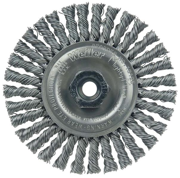Weiler 4" Mini Roughneck Stringer Bead Weld Cleaning Brush is suitable for cleaning root and hot passes and reaching into corners. M10 x 1.25 nut for use on right angle grinders.