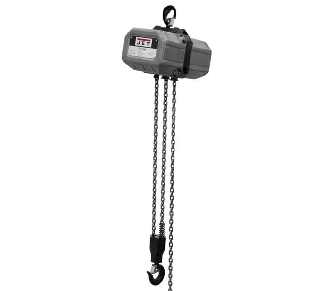 JET® SSC Series electric hoists combines safety and durability to operate in commercial and industrial applications. All models incorporate a slip clutch overload protection mechanism that prevents the hoist from lifting damaging loads above its rated capacity. They are available in single or three phase configurations to suit your electrical needs. Single phase models have a thermal overload protection design that keeps the hoist from overheating, while the three phase models feature a reverse phase relay that protects the hoist from incorrect wiring. The industry proven DC electro-magnetic brake increases safety by holding the load even when power is interrupted. The maintenance-free gear train incorporates a sealed oil bath, for reliability and durability. The JET® SSC series electric hoist is available in ½ ton to 5 ton capacities with standard lifts of 10, 15, and 20 feet (custom lifts available).