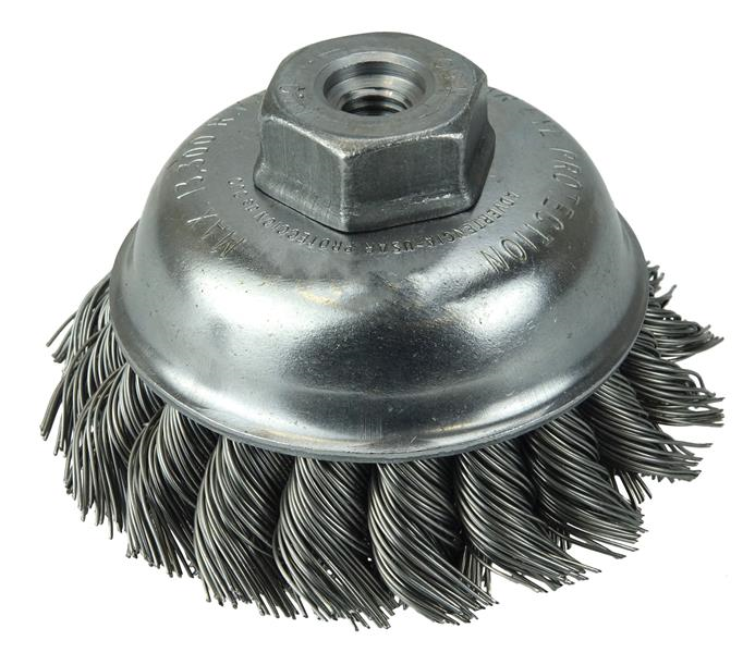 Weiler 3-1/2" Single Row Knot Wire Cup Brush provides heavy-duty brushing action with some flexibility; ideal for demanding cleaning applications on relatively flat surfaces. M10x1.50 nut for use on right angle grinder.