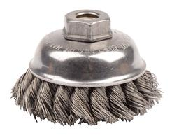 Weiler 3-1/2" Single Row Knot Wire Cup Brush provides a heavy-duty brushing action with some flexibility for demanding cleaning applications on relatively flat surfaces. 3/8"-24 nut for use on right angle grinders.