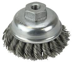 Weiler 3-1/2" Single Row Knot Wire Cup Brush provides a heavy-duty brushing action with some flexibility for demanding cleaning applications on relatively flat surfaces. 1/2"-13 nut for use on right angle grinders.