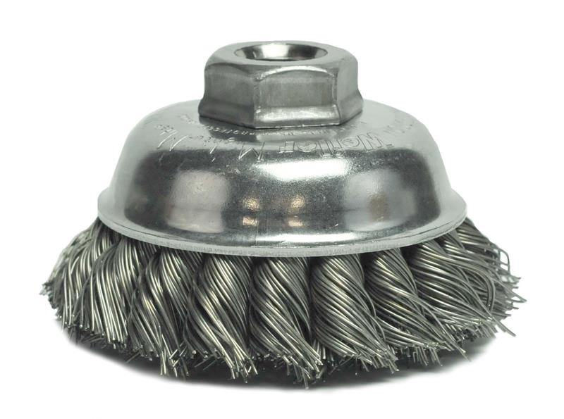 Weiler 3-1/2" Single Row Knot Wire Cup Brush provides a heavy-duty brushing action with some flexibility for demanding cleaning applications on relatively flat surfaces. 5/8"-11 nut for use on right angle grinders.