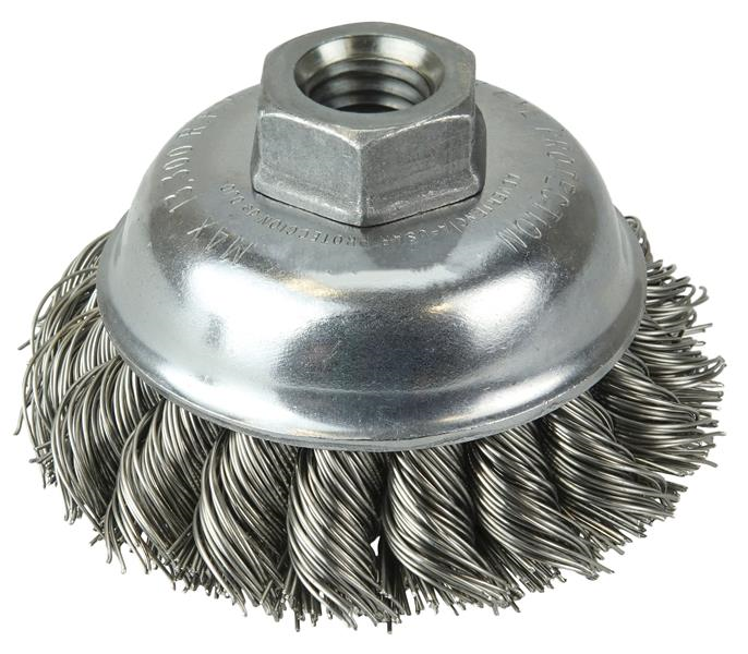 Weiler 3-1/2" Single Row Knot Wire Cup Brush provides a heavy-duty brushing action with some flexibility for demanding cleaning applications on relatively flat surfaces. 5/8"-11 nut for use on right angle grinders.
