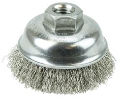 Weiler 3-1/2" Crimped Wire Cup Brush provides very flexible brushing action and the most consistent performance for demanding light to medium duty cleaning applications on relatively flat surfaces. 5/8"-11 nut for use on right angle grinders.