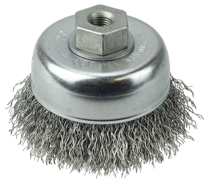 Weiler 3" Crimped Wire Cup Brush provides very flexible brushing action and the most consistent performance for demanding light to medium duty cleaning applications on relatively flat surfaces. 3/8"-24 nut for use on right angle grinders.