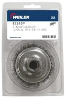 Weiler 3" Crimped Wire Cup Brush provides very flexible brushing action and the most consistent performance for demanding light to medium duty cleaning applications on relatively flat surfaces. 5/8"-11 nut for use on right angle grinders. This product is clamshell packed for retail sale.