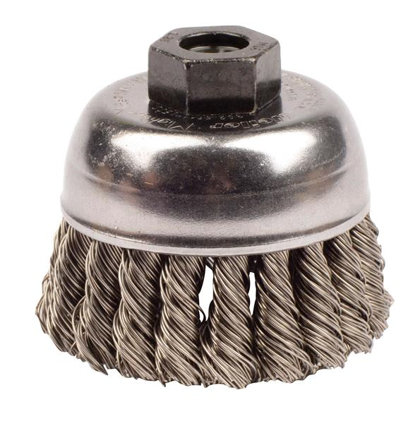 Weiler 2-3/4" Single Row Knot Wire Cup Brush provides heavy-duty brushing action with some flexibility. Ideal for demanding cleaning applications on relatively flat surfaces. M10 x 1.25 nut for use on right angle grinders.