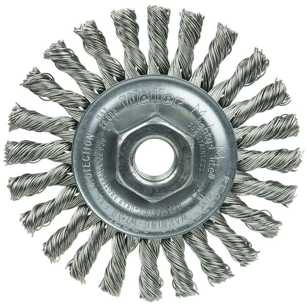 Weiler 4" Cable Twist Knot Wire Wheel Brush provides maximum brushing action with minimal flexibility. Ideal for demanding cleaning applications. 5/8"-11 nut for use on right angle grinders.