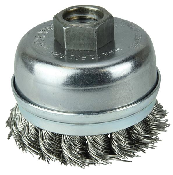 Weiler 2-3/4" Single Row Knot Wire Banded Cup Brush provides heavy-duty brushing action with some flexibility. Ideal for demanding cleaning applications on relatively flat surfaces. 5/8"-11 nut for use on right angle grinders.
