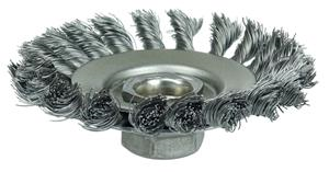 Weiler 4" Knot Wire Bevel Brush provides heavy-duty brushing action with some flexibility for demanding cleaning applications on somewhat irregular surfaces. Ideal for cleaning filet welds and into corners. 5/8"-11 nut for use on right angle grinders.