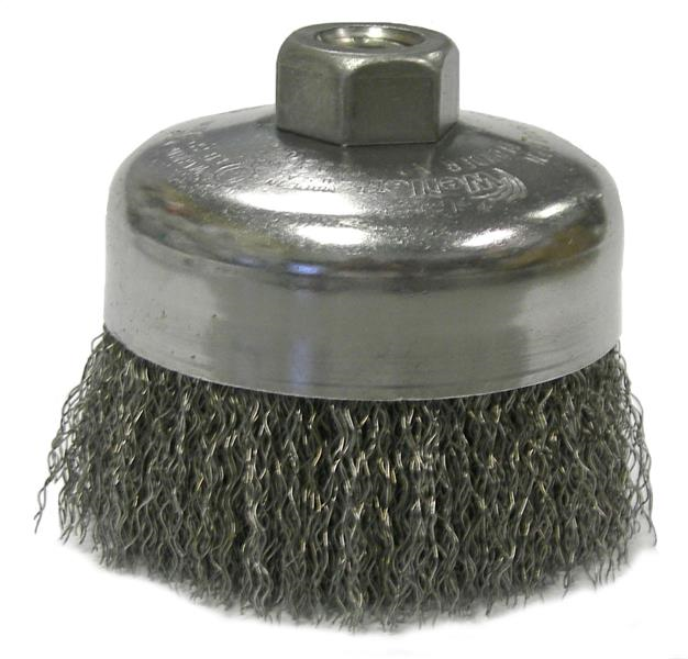 Weiler 4" Crimped Wire Cup Brush provides very flexible brushing action and the most consistent performance for demanding light to medium duty cleaning applications on relatively flat surfaces. 5/8"-11 nut for use on right angle grinders.