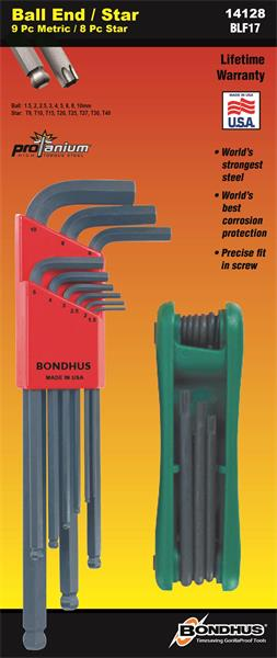 Bonus Double Pack. 10999 (Ball End Tip Hex Key L-wrench Set of 9 Pieces with ProGuard™ Finish. Long Arm. Packaged in Bondhex Color Coded Case. Sizes: 1.5mm, 2mm, 2.5mm, 3mm, 4mm, 5mm, 6mm, 8mm & 10mm) -- & -- 12634 (GorillaGrip Star Tip Fold Up 8 Piece Tool. Color Coded, made of Protanium high torque steel, with ProGuard™ Finish. Includes sizes: T9, T10, T15, T20, T25, T27, T30 & T40)