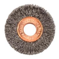 Weiler 1-1/2" Small Diameter Crimped Wire Wheel Brush provides a flexible brushing action and consistent performance for demanding light duty cleaning and deburring applications. Featuring Weiler's solid ring construction, these radial brushes are available in heat-treated steel, type 302 stainless steel and brass wire for use in a wide variety of applications. 3/8" arbor hole for use on die grinder, right angle die grinder and drills.
