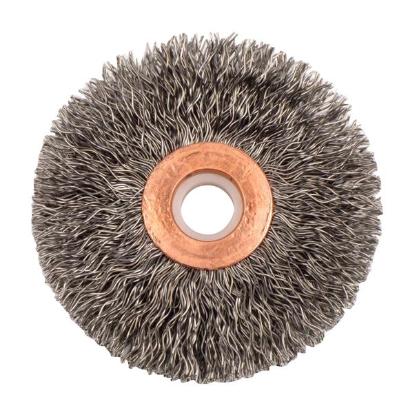Weiler 2-1/2" Small Diameter Crimped Wire Wheel Brush provides a flexible brushing action and consistent performance for demanding light duty cleaning and deburring applications. Featuring Weiler's solid ring construction, these radial brushes are available in heat-treated steel, type 302 stainless steel and brass wire for use in a wide variety of applications. 1/2"-3/8" arbor hole for use on die grinder, right angle die grinder and drills.