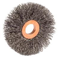 Weiler 3" Small Diameter Crimped Wire Wheel Brush provides a flexible brushing action and consistent performance for demanding light duty cleaning and deburring applications. Featuring Weiler's solid ring construction, these radial brushes are available in heat-treated steel, type 302 stainless steel and brass wire for use in a wide variety of applications. 5/8" arbor hole for use on die grinder, right angle die grinder and drills.