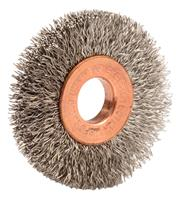 Weiler 1-1/2" Small Diameter Crimped Wire Wheel Brush provides a flexible brushing action and consistent performance for demanding light duty cleaning and deburring applications. Featuring Weiler's solid ring construction, these radial brushes are available in heat-treated steel, type 302 stainless steel and brass wire for use in a wide variety of applications. 3/8" arbor hole for use on die grinder, right angle die grinder and drills.