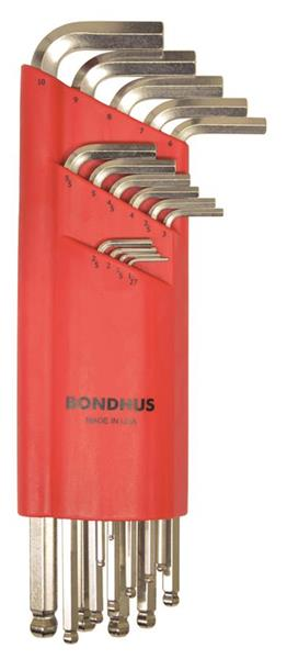 Ball End Tip Hex Key L-wrench Set of 15 with BriteGuard Finish. Extra Long Arm. Packaged in Bondhex Color Coded Case. Includes sizes: 1.27mm, 1.5mm, 2mm, 2.5mm, 3mm, 3.5mm, 4mm, 4.5mm, 5mm, 5.5mm, 6mm, 7mm, 8mm, 9mm & 10mm