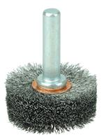 Weiler 1-1/2" Wide Face Stem-Mounted Crimped Wire Wheel provides a flexible brushing action and consistent performance for demanding light-duty cleaning and deburring applications on steel. The permanently-attached 1/4 in stem are primarily intended for use on high speed die grinders. Although they can also be mounted onto a drill, the speed and power of that tool will decrease the effectiveness of the brush. Featuring Weiler's solid ring construction, these radial wheels are available in heat-treated steel, type 302 stainless steel and brass wire.