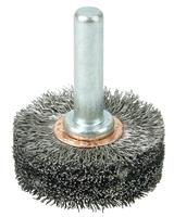 Weiler 1-1/2" Wide Face Stem-Mounted Crimped Wire Wheel provides a flexible brushing action and consistent performance for demanding light-duty cleaning and deburring applications on steel. The permanently-attached 1/4 in stem are primarily intended for use on high speed die grinders. Although they can also be mounted onto a drill, the speed and power of that tool will decrease the effectiveness of the brush. Featuring Weiler's solid ring construction, these radial wheels are available in heat-treated steel, type 302 stainless steel and brass wire.