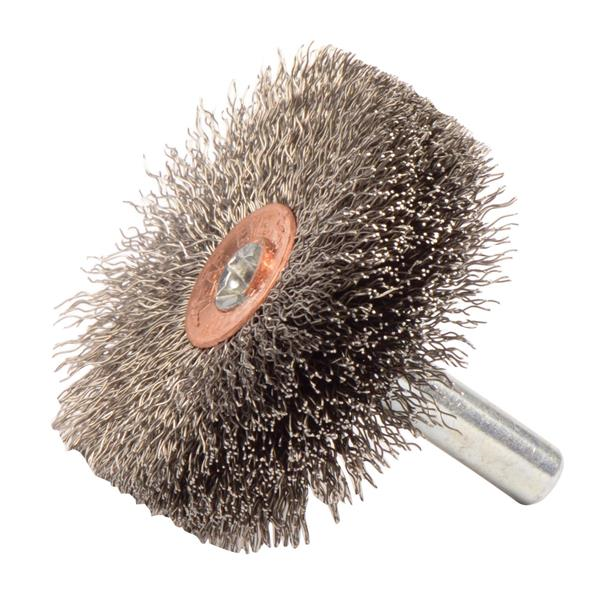 Weiler 1-3/4" Wide Face Stem-Mounted Crimped Wire Wheel provides a flexible brushing action and consistent performance for demanding light-duty cleaning and deburring applications on steel. The permanently-attached 1/4 in stem are primarily intended for use on high speed die grinders. Although they can also be mounted onto a drill, the speed and power of that tool will decrease the effectiveness of the brush. Featuring Weiler's solid ring construction, these radial wheels are available in heat-treated steel, type 302 stainless steel and brass wire.