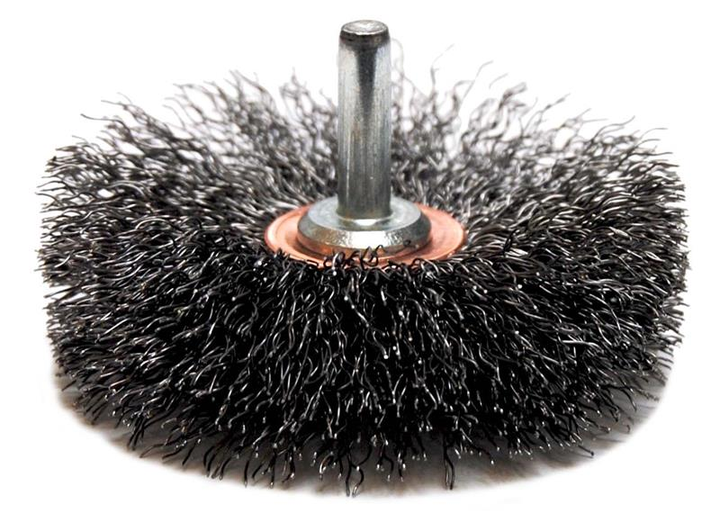 Weiler 3" Narrow Face Stem-Mounted Crimped Wire Wheel provides a flexible brushing action for cleaning and deburring applications on Steel; Armored Steel; Cast Iron; Ductile Iron and Tool Steel. The permanently-attached 1/4 in stem are intended for use on CNC,/Milling/Automatic Machines, Die Grinders, Drills, Drill Presses, Right Angle Die Grinders and Straight Grinders. Although they can also be mounted onto a drill, the speed and power of that tool will decrease the effectiveness of the brush. Featuring Weiler's solid ring construction, these radial wheels are available in heat-treated steel, type 302 stainless steel and brass wire.