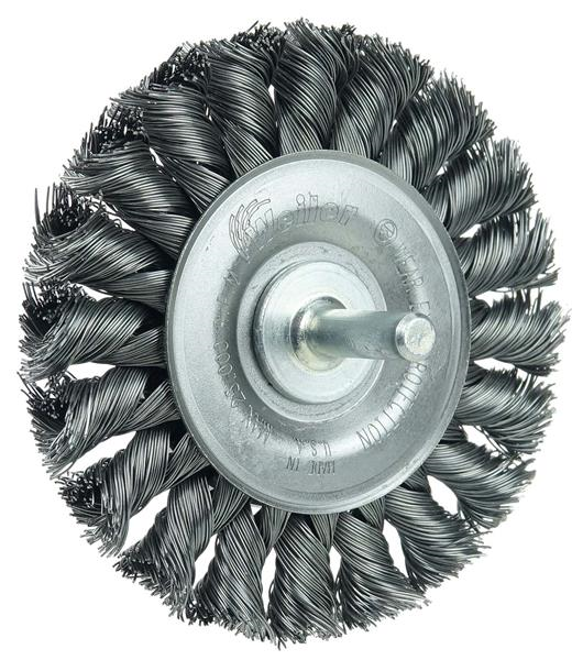 Weiler 3-1/4" Stem-Mounted Knot Wire Wheel provides a heavy-duty brushing action with some flexibility for demanding deburring applications on steel, armored steel, cast iron, ductile iron and tool steel. The permanently-attached 1/4 in stem are intended for use on CNC,/Milling/Automatic Machines, Die Grinders, Drills, Drill Presses, Right Angle Die Grinders and Straight Grinders.
