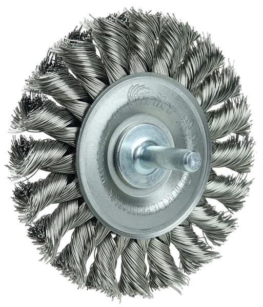 Weiler 3-1/4" Stem-Mounted Knot Wire Wheel provides a heavy-duty brushing action with some flexibility for demanding deburring applications on stainless steel. The permanently-attached 1/4 in stem are intended for use on CNC,/Milling/Automatic Machines, Die Grinders, Drills, Drill Presses, Right Angle Die Grinders and Straight Grinders.