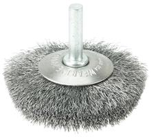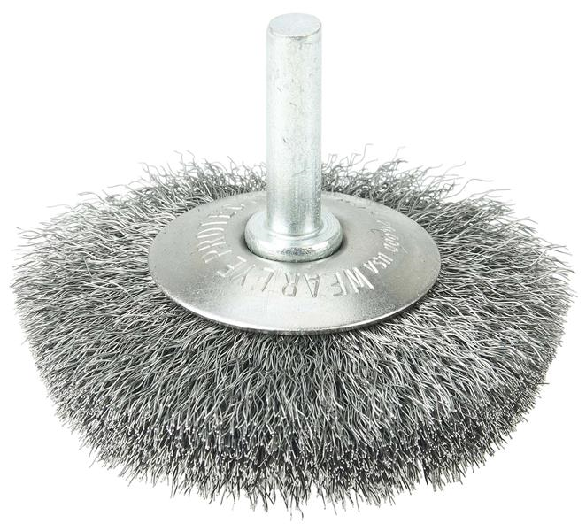 Weiler 2-1/2" Stem-Mounted Concave Crimped Wire Wheel provides a flexible brushing action for addressing corners and hard-to-reach areas on steel. The permanently-attached 1/4 in stem are intended for use on CNC,/Milling/Automatic Machines, Die Grinders, Drills, Drill Presses, Right Angle Die Grinders and Straight Grinders. Although they can also be mounted onto a drill, the speed and power of that tool will decrease the effectiveness of the brush. Featuring Weiler's solid ring construction, these radial wheels are available in heat-treated steel, type 302 stainless steel and brass wire