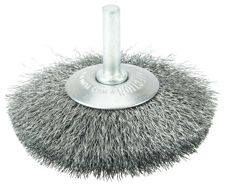 Weiler 3" Stem-Mounted Concave Crimped Wire Wheel provides a flexible brushing action for addressing corners and hard-to-reach areas on steel. The permanently-attached 1/4 in stem are intended for use on CNC,/Milling/Automatic Machines, Die Grinders, Drills, Drill Presses, Right Angle Die Grinders and Straight Grinders. Although they can also be mounted onto a drill, the speed and power of that tool will decrease the effectiveness of the brush. Featuring Weiler's solid ring construction, these radial wheels are available in heat-treated steel, type 302 stainless steel and brass wire