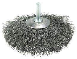 Weiler 4" Stem-Mounted Concave Crimped Wire Wheel provides a flexible brushing action for addressing corners and hard-to-reach areas on steel. The permanently-attached 1/4 in stem are intended for use on CNC,/Milling/Automatic Machines, Die Grinders, Drills, Drill Presses, Right Angle Die Grinders and Straight Grinders. Although they can also be mounted onto a drill, the speed and power of that tool will decrease the effectiveness of the brush. Featuring Weiler's solid ring construction, these radial wheels are available in heat-treated steel, type 302 stainless steel and brass wire