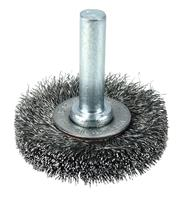 Weiler 1-1/2" Stem-Mounted Crimped Wire Radial Wheel provides a flexible brushing action and consistent performance for demanding light-duty cleaning and deburring applications on steel. Side plates for a shorter trim length and more controlled brushing action. The permanently-attached 1/4 in stem are primarily intended for use on high speed die grinders. Although they can also be mounted onto a drill, the speed and power of that tool will decrease effectiveness of the brush. Featuring Weiler's solid ring construction, these radial wheels are available in heat-treated steel, type 302 stainless steel and brass wire.